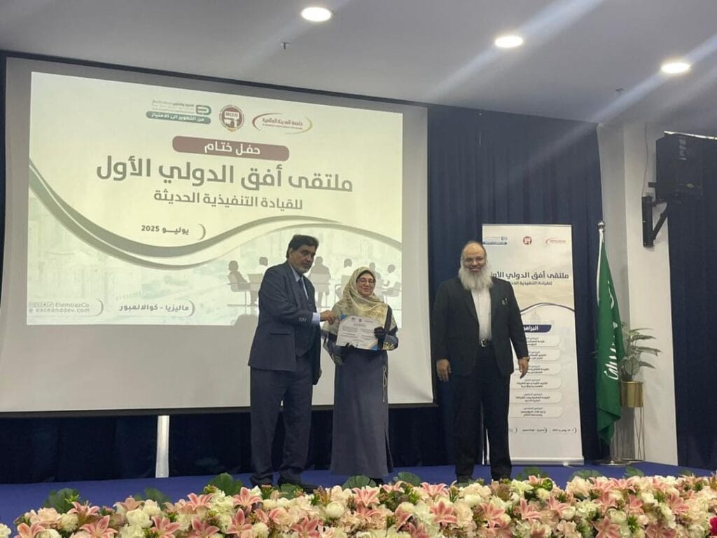 تكريم دكتورة نسرين سليمان من الدكتور سعيد الحازمى رئيس جامعة المدينة العالمية بماليزيا 🇲🇾 و الدكتور محمد الزهراني المدير التنفيذى لملتقى أفق الدولى للقيادة التنفيذية الحديثة بجامعة المدينة العالمية بماليزيا 🇲🇾